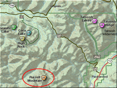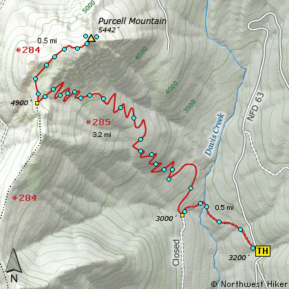 2.5 miles you will intersect the Purcell Mtn Trail #284. Now you follow the