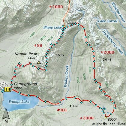 and up a steep hill for another 5.2 miles to Walupt Lake. There is a campground on