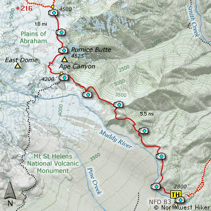 5.5 miles to the junction with the Loowit Trail #216, which goes completely
