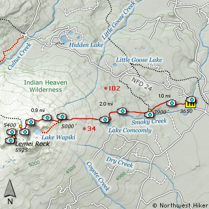 and you will pass the trailhead for Wapiki Lake and Lemei Rock.