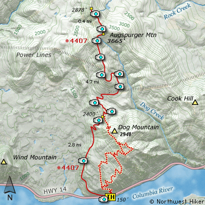 area and trailheads for both the Dog Mountain and Augspurger Mountain hikes.