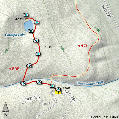 To reach the trailhead for Catalpa Lake, follow US 26 east of Mt. Hood