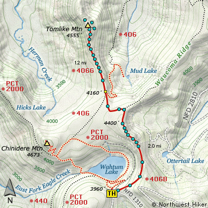 A trail now follows that old road along Waucoma Ridge to the east and to Rainy Lake. The trail to Tomlike Mountain