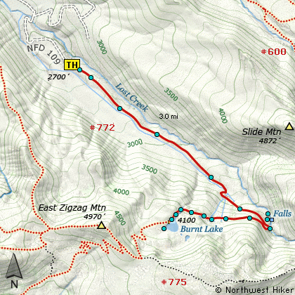 on the trail to Burnt Lake. See the map above for reference to the falls.