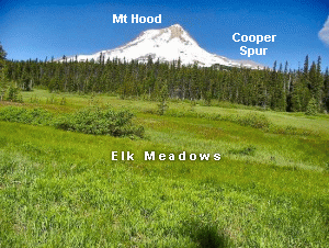 views of the meadow and of Mt Hood as you circle the meadow on this perimeter trail.