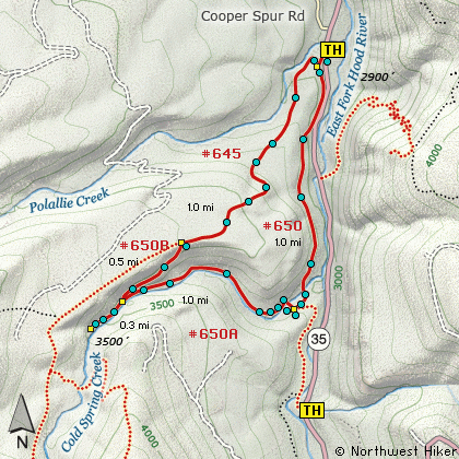Cold Spring Creek and follows the East Fork of the Hood River back to the Polallie trailhead.
