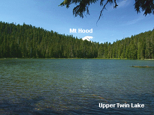 a forested area. When you reach the upper lake, you should see the top of Mt Hood