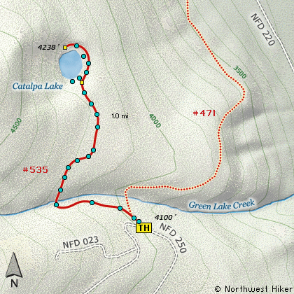 To reach the trailhead for Catalpa Lake, follow US 26 east of Mt. Hood