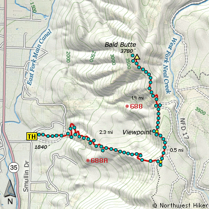 distance to Trail #688, then bear left, or north, and head for Bald Butte.