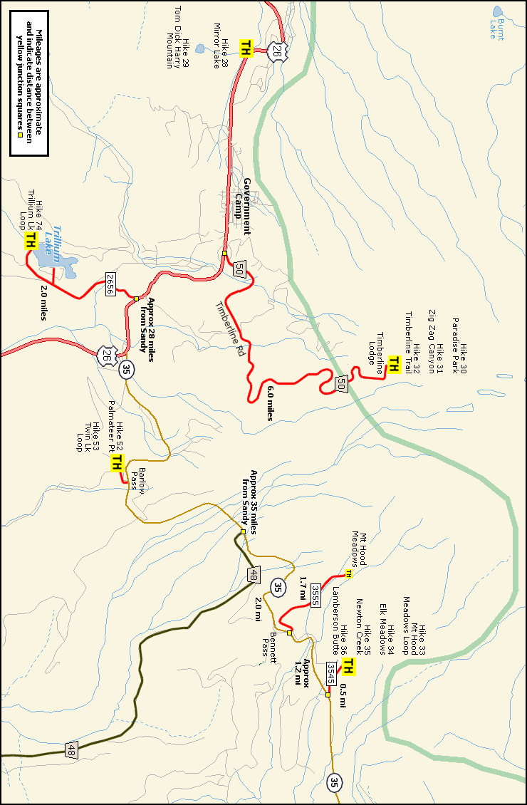 Directions to Trailheads to: Paradise Park, Zig Zag Canyon, Timberline Trai, Mt Hood Meadows Loop Elk Meadows, Newton Creek, Lamberson Butte, Trillium Lake Barlow Pass to Palmateer Point, and Barlow Pass Twin Lakes Loop THIS MAP IS NOT INTENDED TO BE LEGIBLE UNTIL IT IS PRINTED.