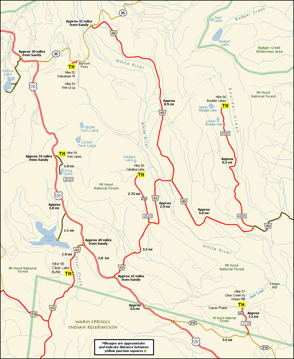 Directions to Trailheads to: Barlow Pass to Palmateer Point, Barlow Pass Twin Lakes Loop Twin Lakes from Frog Lake TH, Catalpa Lake, Boulder Lakes Clear Lake Butte and Clear Creek Trail to Keeps Mill THIS MAP IS NOT INTENDED TO BE LEGIBLE UNTIL IT IS PRINTED.