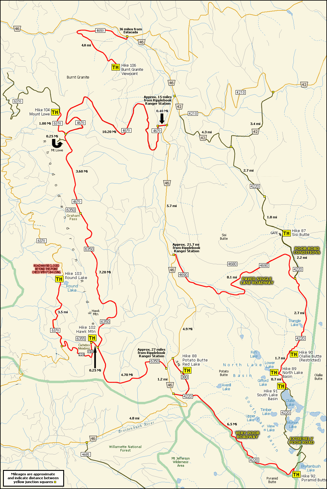 Directions to Trailheads to: Sisi Butte, Potato Butte, North Olallie Lake Basin Olallie Butte, South Olallie Lake Basin, Pyramid Butte Hawk Mountain, Round Lake, Mount Lowe, Burnt Granite viewpoint THIS MAP IS NOT INTENDED TO BE LEGIBLE UNTIL IT IS PRINTED.