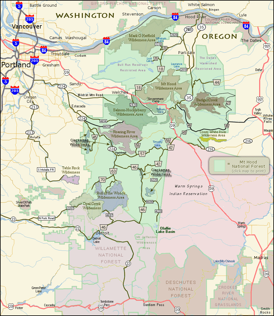 Vicinity Map for the roads and places within the Mt Hood National Forest and Wilderness Areas